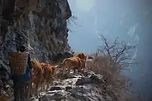 Suivant Nangsa Lainchung[22], entre le Sichuan et le Tibet central « le sentier s'étend sur environ 2 350 km, passant par 56 relais... Le sentier franchit 15 ponts de cordes et 10 ponts de câble métallique, gravit 78 montagnes dont 11 ayant plus de 2 700 m de haut et 27 de plus de 1 650 m. Le voyage d'un bout à l'autre prendra au moins trois mois ». Certaines caravanes mettaient plus de cinq mois pour faire le voyage[23]. Le transport se fait à dos d'hommes jusqu'à la première étape de Kangding, puis à dos de yacks. Les yacks sont des animaux robustes, plus aptes que les chevaux à supporter les grands froids des hautes altitudes.