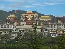 Zhongdian dont le nom tibétain est Gyalthang[n 16], est la porte d'entrée dans l'aire culturelle tibétaine du Kham, comme Kangding/Tatsienlou l'était pour la piste Sichuan-Tibet. Pour atteindre Lhassa, restaient encore 1 600 km de piste de hautes montagne à parcourir. Le plus grand monastère lamaïste (gelugpa) du Yunnan, Ganden Sumtsenling (tibétain དགའ་ལྡན་སུམ་རྩེན་གླིང་, Wylie : dga' ldan sum rtsen gling, pinyin tibétain : Songzanlin), se trouve à quelques kilomètres de la ville, à plus de 3 300 mètres d'altitude, dans un emplacement dominant majestueusement la région, choisi par le cinquième dalaï-lama en 1679. Très endommagé durant la révolution culturelle, il a été reconstruit depuis. Comme tous les grands monastères, il se livrait au commerce du thé. De riches lamas-marchands possédaient un grand nombre de mules de bâts pour effectuer le transport du thé et d'autres marchandises jusqu'au Tibet Central. Les moines s'occupaient aussi du commerce de détail. Il était demandé aux maisonnées de laisser un morceau de beurre de dri près de leur maison, certaines nuits déterminées de l'année. Le matin, la famille trouvait à la place du tuocha (thé pu-erh compressé en forme de nid), ce tour de force tenait simplement aux moines qui faisaient la tournée de toutes les maisons la nuit[4].