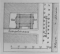 L'ancienne synagogue se trouvait sur les rives du Rhin, du côté nord de la Judengasse, ainsi nommée depuis 1715, rebaptisée Tempelstraße en 1886 après l'inauguration de la synagogue. La rue étant en pente, l'architecte a prévu lors de la construction d'ériger une terrasse de 1,3 m de haut pour compenser ce dénivelé.