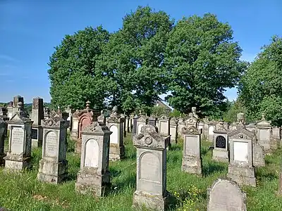 Certains éléments de cette synagogue, dont les Tables de la Loi qui la surmontaient, ont été déposés au cimetière juif.