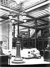 L'espace intérieur, continu et aéré, se compose de deux niveaux reliés par une cage d'escalier centrale. L’espace central de prestige s’ouvre sur un hall à colonnes classiques, ouvert sur l’étage supérieur recouvert de deux vastes coupoles vitrées. Devant l’escalier, un réverbère en fer et granit comprend plusieurs bras supportant des boules en opaline. Le sol est composé de mosaïques de marbre, bordé d’un motif floral continu identique à celui des vitraux qui entourent les vitres des plafonds à voussettes.