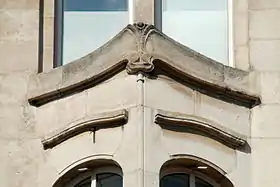 La travée de gauche, très étroite, intègre la porte d'entrée surmontée de deux oculi[3] ovales et d'une console en pierre ornée d'un décor de style Art nouveau floral du plus bel effet.