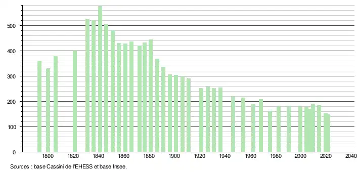 L'évolution du nombre d'habitants est connue à travers les recensements de la population effectués dans la commune depuis 1793. Pour les communes de moins de 10 000 habitants, une enquête de recensement portant sur toute la population est réalisée tous les cinq ans, les populations légales des années intermédiaires étant quant à elles estimées par interpolation ou extrapolation[19]. Pour la commune, le premier recensement exhaustif entrant dans le cadre du nouveau dispositif a été réalisé en 2004[20].