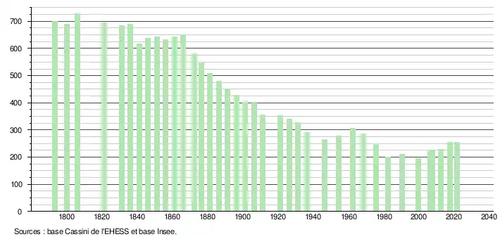 L'évolution du nombre d'habitants est connue à travers les recensements de la population effectués dans la commune depuis 1793. Pour les communes de moins de 10 000 habitants, une enquête de recensement portant sur toute la population est réalisée tous les cinq ans, les populations légales des années intermédiaires étant quant à elles estimées par interpolation ou extrapolation[29]. Pour la commune, le premier recensement exhaustif entrant dans le cadre du nouveau dispositif a été réalisé en 2007[30].
