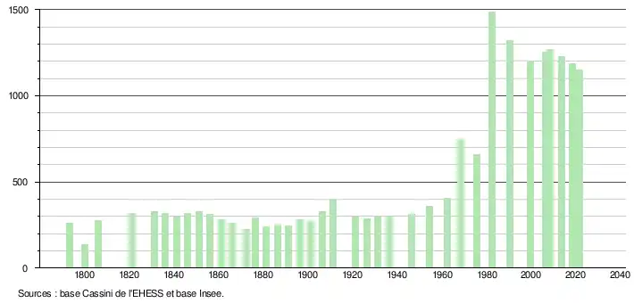 L'évolution du nombre d'habitants est connue à travers les recensements de la population effectués dans la commune depuis 1793. Pour les communes de moins de 10 000 habitants, une enquête de recensement portant sur toute la population est réalisée tous les cinq ans, les populations légales des années intermédiaires étant quant à elles estimées par interpolation ou extrapolation[16]. Pour la commune, le premier recensement exhaustif entrant dans le cadre du nouveau dispositif a été réalisé en 2008[17].