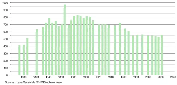 L'évolution du nombre d'habitants est connue à travers les recensements de la population effectués dans la commune depuis 1793. Pour les communes de moins de 10 000 habitants, une enquête de recensement portant sur toute la population est réalisée tous les cinq ans, les populations légales des années intermédiaires étant quant à elles estimées par interpolation ou extrapolation[15]. Pour la commune, le premier recensement exhaustif entrant dans le cadre du nouveau dispositif a été réalisé en 2006[16].