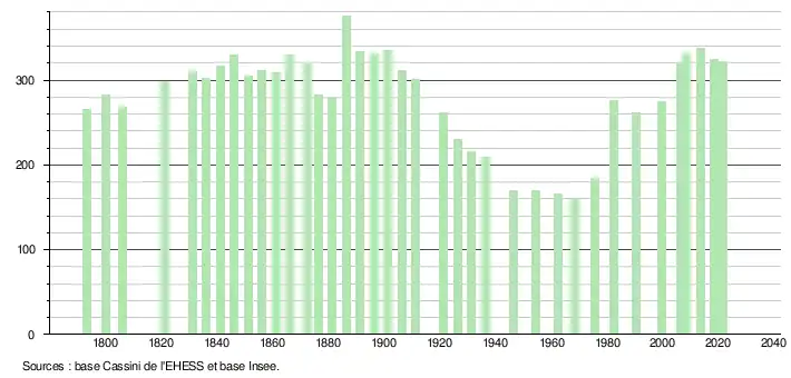 L'évolution du nombre d'habitants est connue à travers les recensements de la population effectués dans la commune depuis 1793. Pour les communes de moins de 10 000 habitants, une enquête de recensement portant sur toute la population est réalisée tous les cinq ans, les populations légales des années intermédiaires étant quant à elles estimées par interpolation ou extrapolation[23]. Pour la commune, le premier recensement exhaustif entrant dans le cadre du nouveau dispositif a été réalisé en 2008[24].