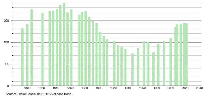 L'évolution du nombre d'habitants est connue à travers les recensements de la population effectués dans la commune depuis 1793. Pour les communes de moins de 10 000 habitants, une enquête de recensement portant sur toute la population est réalisée tous les cinq ans, les populations légales des années intermédiaires étant quant à elles estimées par interpolation ou extrapolation[33]. Pour la commune, le premier recensement exhaustif entrant dans le cadre du nouveau dispositif a été réalisé en 2008[34].