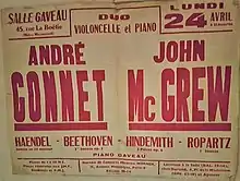 En 1958, André Gonnet et John McGrew jouent pour la première fois en France une sonate d'Edouard Salim Michaël[2]. En 1966, André Gonnet enregistre avec John McGrew la Sonate de concert en mi majeur pour violoncelle et piano, op. 47 de Charles-Valentin Alkan, qu'ils jouèrent pour la première fois devant un public français[3]. Cette année là, ils enregistrent aussi Yogata, suite pour piano et violoncelle de Jean-Jacques Laubry[4]. Le 22 novembre 1967, les deux musiciens donnent un concert de musique romantique (Brahms, Schumann, Chopin) au Théâtre Grévin à Paris[5]. Naowba, suite pour violoncelle seul du compositeur marocain Ahmed Essyad composée sur une forme musicale empruntée à la musique andalouse et développée par Ziri Ab au XIIIe siècle, est écrite à la demande d'André Gonnet, et créée par lui en décembre 1969[6],[7]