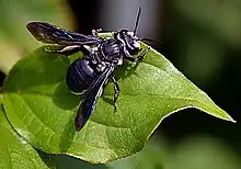 Les adultes mesurent jusqu'à 13–15 millimètres de long, les femelles étant légèrement plus grandes que les mâles. Cet insecte a un corps noir brillant, avec des touffes de poils blancs veloutés sur la fovéa faciale, de part et d'autre du thorax, sur les derniers tergites abdominaux et sur les fémurs de la troisième paire de pattes. Les ailes ont des reflets bleutés[1].