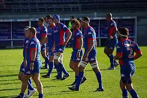 Andrew Farley sous les couleurs du FC Grenoble (au centre de la photo avec un casque bleu).
