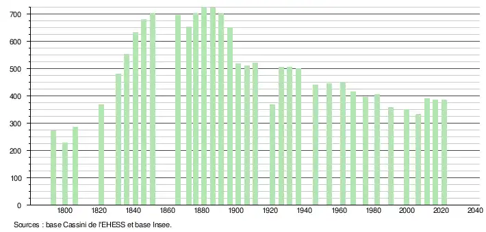 L'évolution du nombre d'habitants est connue à travers les recensements de la population effectués dans la commune depuis 1793. Pour les communes de moins de 10 000 habitants, une enquête de recensement portant sur toute la population est réalisée tous les cinq ans, les populations légales des années intermédiaires étant quant à elles estimées par interpolation ou extrapolation[17]. Pour la commune, le premier recensement exhaustif entrant dans le cadre du nouveau dispositif a été réalisé en 2006[18].