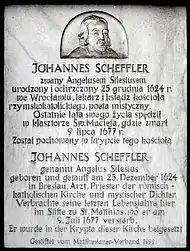 Angelus Silesius ou Johannes Angelus Silesius, né Johannes Scheffler en à Breslau (en Basse-Silésie, alors sous domination de la dynastie autrichienne des Habsbourg) et mort le dans la même ville, est un poète, médecin, théologien, prêtre (franciscain) et mystique allemand. Ses épigrammes profondément religieuses, d'un mysticisme très aigu et particulier, sont considérées comme l'une des œuvres lyriques les plus importantes de la littérature baroque. Il est à ce titre parfois surnommé « le Prophète de l'Ineffable[1] ».