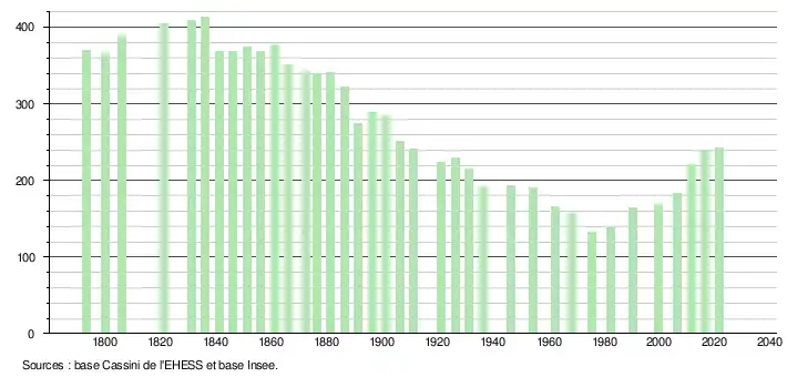 L'évolution du nombre d'habitants est connue à travers les recensements de la population effectués dans la commune depuis 1793. Pour les communes de moins de 10 000 habitants, une enquête de recensement portant sur toute la population est réalisée tous les cinq ans, les populations légales des années intermédiaires étant quant à elles estimées par interpolation ou extrapolation[31]. Pour la commune, le premier recensement exhaustif entrant dans le cadre du nouveau dispositif a été réalisé en 2006[32].