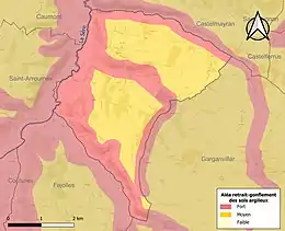 Le retrait-gonflement des sols argileux est susceptible d'engendrer des dommages importants aux bâtiments en cas d’alternance de périodes de sécheresse et de pluie. La totalité de la commune est en aléa moyen ou fort (92 % au niveau départemental et 48,5 % au niveau national). Sur les 100 bâtiments dénombrés sur la commune en 2019, 100 sont en aléa moyen ou fort, soit 100 %, à comparer aux 96 % au niveau départemental et 54 % au niveau national. Une cartographie de l'exposition du territoire national au retrait gonflement des sols argileux est disponible sur le site du BRGM[25],[Carte 2].