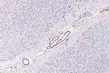 - Marqueurs en IRM cérébrale. Outre les marqueurs hémorragiques déjà mentionnés, la valeur diagnostique de quasi tous les marqueurs classiques de microangiopathie à l'IRM ont été étudiés, en particulier pour différencier l'AAC de l'angiopathie hypertensive. En particulier, plusieurs travaux se sont intéressés à la distribution des hypersignaux de la substance blanche. L'AAC semble se caractériser par une tendance à présenter des hypersignaux de substance blanche plutôt cortico-sous-corticale (proche du cortex) alors que l'angiopathie hypertensive touche plus spécifiquement les capsules externes et le tronc cérébral[18]. La présence d'hypersignaux punctiformes en IRM de diffusion a également été considéré comme un marqueur potentiel de l'AAC, mais cette association n'a pas été retrouvée dans une méta-analyse de 2018[19]. À l'heure actuelle, seule la présence de dilatation des espaces de Virchow-Robin de topographie sous-corticale a montré une bonne corrélation avec les données histologiques.