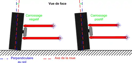 L'angle de carrossage est positif si le haut de la roue est à l'extérieur. S'il est négatif, c'est à l'intérieur.