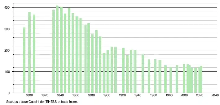 L'évolution du nombre d'habitants est connue à travers les recensements de la population effectués dans la commune depuis 1793. Pour les communes de moins de 10 000 habitants, une enquête de recensement portant sur toute la population est réalisée tous les cinq ans, les populations légales des années intermédiaires étant quant à elles estimées par interpolation ou extrapolation[25]. Pour la commune, le premier recensement exhaustif entrant dans le cadre du nouveau dispositif a été réalisé en 2004[26].
