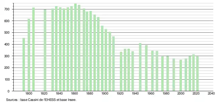 L'évolution du nombre d'habitants est connue à travers les recensements de la population effectués dans la commune depuis 1793. Pour les communes de moins de 10 000 habitants, une enquête de recensement portant sur toute la population est réalisée tous les cinq ans, les populations légales des années intermédiaires étant quant à elles estimées par interpolation ou extrapolation[27]. Pour la commune, le premier recensement exhaustif entrant dans le cadre du nouveau dispositif a été réalisé en 2006[28].