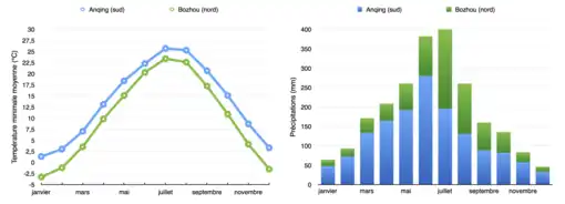 L'Anhui jouit d'un climat subtropical humide caractérisé par des étés humides chauds et par des hivers secs assez froids. Les températures moyennes au nord du bassin du Huai He vont de 0 °C (en janvier) à 28 °C (en juillet). La province s'étendant sur plus de 500 km sur un axe nord-sud, le climat y varie légèrement. Le nord subit le gel 130 à 160 jours par an quand le sud n'y est soumis que 100 à 130 jours par an. Le bassin du Yangzi au Sud est également plus humide que le nord de la province, avec une hygrométrie moyenne de 76 %[5] contre 70 % pour le nord[6]. Les précipitations varient sensiblement avec la latitude. Ainsi le sud de la province reçoit en moyenne entre 1200 et 1 800 mm de précipitations avec une pluviométrie qui augmente lorsqu'on se rapproche du mois de juin alors que le nord n'en reçoit qu'entre 600 et 800 mm, plus de la moitié étant reçue entre les mois de juin et de septembre.
