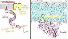 Les ankyrines sont une famille de protéines qui interviennent dans la fixation des protéines membranaires intégrales au cytosquelette membranaire à base de spectrine - actine[1]. Les ankyrines ont des sites de liaison pour la sous-unité bêta de la spectrine et au moins 12 familles de protéines membranaires intégrales. Cette liaison est nécessaire pour maintenir l'intégrité des membranes plasmiques et pour ancrer des canaux ioniques spécifiques, des échangeurs d'ions et des transporteurs d'ions dans la membrane plasmique. Le nom est dérivé du mot grec ἄγκυρα (ankyra) pour "ancre".