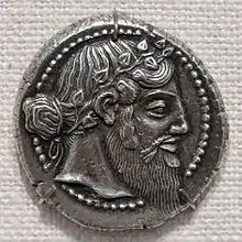 Tétradrachme de Naxos en Sicile, un des chefs-d'œuvre de l'art monétaire grec, vers 461-450 av. J.-C..