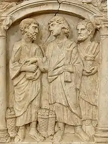 Multiplication des pains et des poissons. Détail d'un panneau de front d'un sarcophage romain à colonnes, vers 350-375 ap. J.-C.