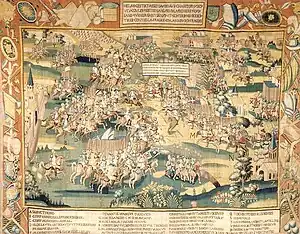 - Quatre alexandrins tissés sur une tapisserie laissent entendre qu'au XVIe siècle, une fonction religieuse druidique était assignée au Lendit ; la tapisserie La bataille de Saint-Denis (1567) datant d'entre 1570 et 1589 évoque les « Champs Druydes » et regrettent qu'en ce lieu les Français tuent d'autres Français[17].