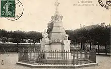 - Mémorial à la gloire du comte de Dampierre, aujourd'hui dans le cimetière communal de Bagneux. Par une délibération du , le conseil municipal de Bagneux approuve et appuie la demande des souscripteurs auprès du préfet de la Seine afin qu’il autorise l'édification d’un monument commémoratif au milieu de la place dite de Dampierre. Il est inauguré le . Lors du réaménagement de la place, il est déplacé au cimetière communal et restauré. L'architecte en est Albert Lalanne (1844-1930)[9], les entrepreneurs Lebègue et ses gendres[10]. Il y est inscrit : « DIEU PATRIE / À LA MÉMOIRE DE / ANNE-MARIE-ANDRE-HENRI / PICOT, CTE DE DAMPIERRE / COMMANDANT / DU IER BATon DE MOBILES DE L’AUBE / FRAPPÉ A MORT POUR LA FRANCE À BAGNEUX / LE 13 OCTOBRE 1870 MONUMENT ÉLEVÉ / PAR SOUSCRIPTION PRIVÉE / SUR L’INITIATIVE DES HABITANTS / ET DE M. LEVIAUX / MAIRE DE BAGNEUX / AVEC LE CONCOURS DE MM. METZ ET A. LALANNE, ARCHITECTES / ET DE M. VASSELOT, STATUAIRE / INAUGURÉ LE 13 OCTOBRE 1874 AUX MOBILES DE L’AUBE / AUX SOLDATS DE TOUTES LES ARMES / QUI ONT SUCCOMBÉ A BAGNEUX LE 13 OCTOBRE 1874. »