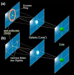 Selon la théorie de la relativité générale ainsi que la théorie corpusculaire de la lumière, la lumière suit la courbure de l'espace-temps. Ainsi, si un rayon de lumière passe dans le champ gravitationnel d'un objet massif tel une étoile, il est dévié[9], comme le ferait une lentille optique.