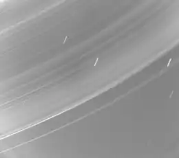 Une analyse détaillée des images de Voyager 2 a révélé des variations azimutales de la brillance de l’anneau λ[17]. Les variations semblent périodiques, évoquant une onde stationnaire. L’origine de cette structure détaillée de l’anneau λ reste mystérieuse[15].