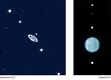 En 1986, la sonde spatiale Voyager 2 traverse le système d’Uranus et permet une observation directe de ses anneaux[11],[12]. Les images de la sonde révèlent la présence de deux anneaux étroits supplémentaires. En 2003-2005, le télescope spatial Hubble détecte une nouvelle paire d’anneaux, portant le total connu à treize[7]. La découverte de ces anneaux externes double le diamètre du système d’anneaux connu[13]. Hubble prend également pour la première fois des images de deux petits satellites ; l'orbite de l'un d'eux, Mab, se trouve dans l’anneau extérieur récemment découvert[14].