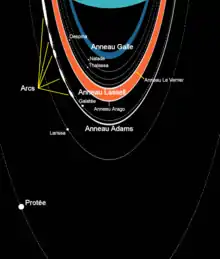 Neptune possède cinq anneaux distincts nommés (par ordre croissant de distance par rapport à la planète) Galle, Le Verrier, Lassell, Arago et Adams. Trois d'entre eux sont étroits, avec des largeurs d'environ 100 km maximum ; Galle et Lassell, en revanche, sont très larges – entre 2 000 et 5 000 km. L'anneau Adams se compose de cinq arcs clairs, pris au sein d'un anneau continu plus faible. En suivant le sens antihoraire, les arcs sont nommés : Fraternité, Égalité (1 et 2), Liberté, et Courage. Les trois premiers noms viennent de la devise française. Cette terminologie fut proposée par ceux qui en firent la découverte lors d'occultations stellaires en 1984 et 1985. Quatre petites lunes ont des orbites à l'intérieur du système d'anneaux : Naïade et Thalassa ont leurs orbites dans l'intervalle entre les anneaux de Galle et Le Verrier. Despina est juste à l'intérieur de l'anneau Le Verrier et Galatée est vers l'intérieur de l'anneau Adams.