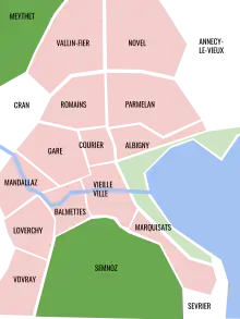 Le territoire d'Annecy est divisé en deux parties qui se distinguent par le relief, l'urbanisme et la végétation. Le nord et le sud-ouest sont plats, encadrés à l'est par la colline d'Annecy-le-Vieux, qui est en fait une langue morainique, à l'ouest par la dépression occupée par le Fier, et la colline de Seynod et de Gevrier. Fortement urbanisée, la ville s'y étale avec la majorité de ses équipements. Le sud-est est, quant à lui, occupé par la montagne du Semnoz. Très peu construit ou aménagé, sauf à son extrémité nord, il est occupé en majeure partie par une forêt de conifères plantée au XIXe siècle sur le Crêt du Maure. La commune se situe sur une partie des rives nord et ouest du lac d'Annecy[2]. Cette situation lacustre a fortement influencé son émergence avec les canaux du Thiou, du Vassé, de Saint-Dominique, le port de plaisance des Marquisats et les deux plages des Marquisats et de l'Impérial.