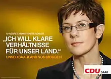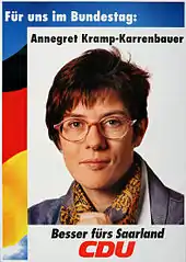 Annegret Kramp-Karrenbauer [ˈʔanəɡʁeːt ˈkʁamp ˈkaʁənˌbaʊ̯ɐ][1], née Kramp le à Völklingen, dite AKK [aːkaːkaː][1], est une femme politique allemande. Elle est membre de l'Union chrétienne-démocrate d'Allemagne (CDU), dont elle est présidente fédérale entre 2018 et 2021.
