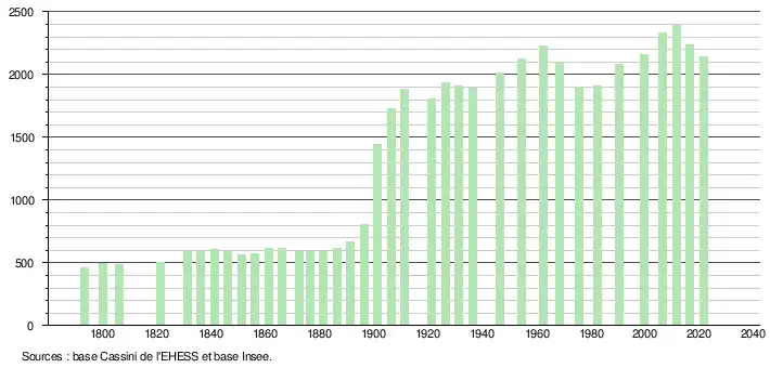 L'évolution du nombre d'habitants est connue à travers les recensements de la population effectués dans la commune depuis 1793. Pour les communes de moins de 10 000 habitants, une enquête de recensement portant sur toute la population est réalisée tous les cinq ans, les populations légales des années intermédiaires étant quant à elles estimées par interpolation ou extrapolation[34]. Pour la commune, le premier recensement exhaustif entrant dans le cadre du nouveau dispositif a été réalisé en 2006[35].