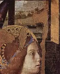 Dans la partie inférieure très abîmée, il est possible de discerner la figure d'un donateur, probablement le prêtre mentionné dans l'acte notarié.