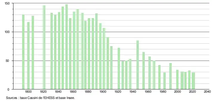 L'évolution du nombre d'habitants est connue à travers les recensements de la population effectués dans la commune depuis 1793. Pour les communes de moins de 10 000 habitants, une enquête de recensement portant sur toute la population est réalisée tous les cinq ans, les populations légales des années intermédiaires étant quant à elles estimées par interpolation ou extrapolation[14]. Pour la commune, le premier recensement exhaustif entrant dans le cadre du nouveau dispositif a été réalisé en 2005[15].