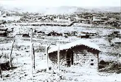 En 1893, las de tant de pérégrinations à travers les hautes terres, et se trouvant alors hors-la-loi, Conselheiro résolut d’établir, sur la rive nord du fleuve Vaza-Barris, un foyer de peuplement permanent pour sa troupe sans cesse grandissante de quasi-insurgés[54]. Près de la ville de Monte Santo, dans l’extrémité nord-est de l’État de Bahia, dans la zone nommée Canudos, il fonda ainsi le village de Belo Monte, dans un domaine agricole abandonné situé au milieu des montagnes.