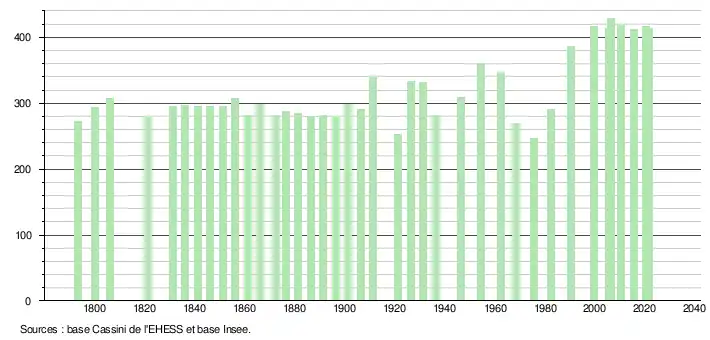 L'évolution du nombre d'habitants est connue à travers les recensements de la population effectués dans la commune depuis 1793. Pour les communes de moins de 10 000 habitants, une enquête de recensement portant sur toute la population est réalisée tous les cinq ans, les populations légales des années intermédiaires étant quant à elles estimées par interpolation ou extrapolation[23]. Pour la commune, le premier recensement exhaustif entrant dans le cadre du nouveau dispositif a été réalisé en 2005[24].