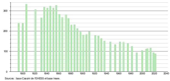 L'évolution du nombre d'habitants est connue à travers les recensements de la population effectués dans la commune depuis 1793. Pour les communes de moins de 10 000 habitants, une enquête de recensement portant sur toute la population est réalisée tous les cinq ans, les populations légales des années intermédiaires étant quant à elles estimées par interpolation ou extrapolation[14]. Pour la commune, le premier recensement exhaustif entrant dans le cadre du nouveau dispositif a été réalisé en 2008[15].