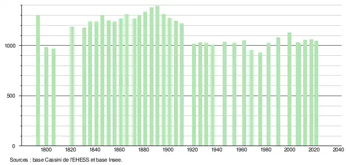 L'évolution du nombre d'habitants est connue à travers les recensements de la population effectués dans la commune depuis 1793. Pour les communes de moins de 10 000 habitants, une enquête de recensement portant sur toute la population est réalisée tous les cinq ans, les populations légales des années intermédiaires étant quant à elles estimées par interpolation ou extrapolation[18]. Pour la commune, le premier recensement exhaustif entrant dans le cadre du nouveau dispositif a été réalisé en 2007[19].