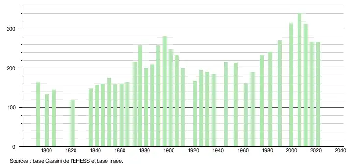 L'évolution du nombre d'habitants est connue à travers les recensements de la population effectués dans la commune depuis 1793. Pour les communes de moins de 10 000 habitants, une enquête de recensement portant sur toute la population est réalisée tous les cinq ans, les populations légales des années intermédiaires étant quant à elles estimées par interpolation ou extrapolation[25]. Pour la commune, le premier recensement exhaustif entrant dans le cadre du nouveau dispositif a été réalisé en 2006[26].