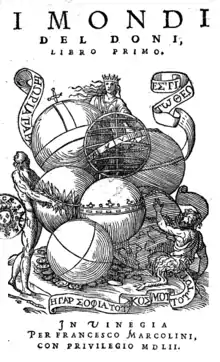 - I Mondi celesti, terrestri et infernali degli accademici Pellegrini, Venise, 1552 et 1553, in-4°. Dans la 1re partie ce sont des Mondes Piccolo, grande, misto, visibile, imaginato, de’ pazzi et massimo ; dans la 2e l’inferno degli scolari, de’ malmaritati, delle Puttane e Ruffiani, soldati e capitani poltroni, etc. L’auteur réimprima et refondit plusieurs fois cet ouvrage, composé de visions, de dialogues, de fictions morales mêlées, à son ordinaire, de bizarreries et de trivialités. Les Mondes furent traduits en français par Gabriel Chappuys, Tourangeau, Lyon, trois éditions in-8° ; dans la 2e édition, donnée en 1580, le traducteur ajouta à tous les autres Mondes celui des cornus, et dans la 3e, 1583, aux autres enfers, celui des ingrats.