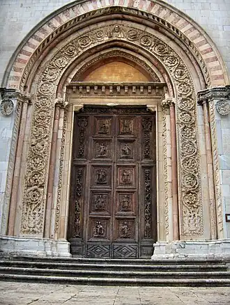 Portail de la cathédrale de Todi, dont les quatre panneaux de noyer supérieur de la porte en bois sont d'Antonio Bencivenni de Mercatello (1521)