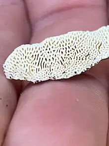 Les antrodiæ s'étendent sur leur surface de croissance avec l'hyménium exposé sur l'extérieur ; ses bords sont retournés pour former des «crochets» (de forme : [ ]). Lorsqu'ils sont présents, ces crochets sont généralement blancs ou brun pâle.