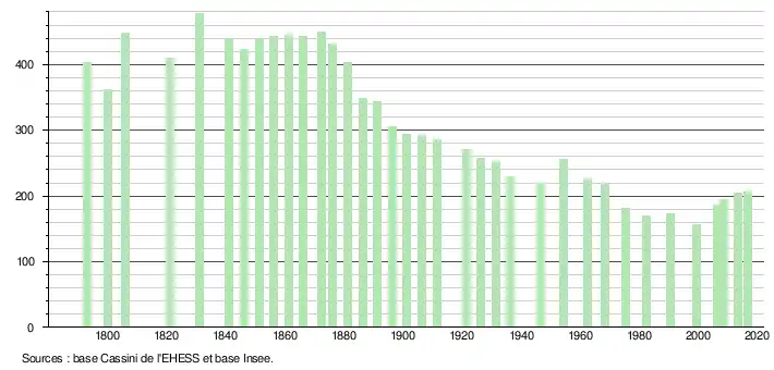 L'évolution du nombre d'habitants est connue à travers les recensements de la population effectués dans la commune depuis 1793. Pour les communes de moins de 10 000 habitants, une enquête de recensement portant sur toute la population est réalisée tous les cinq ans, les populations légales des années intermédiaires étant quant à elles estimées par interpolation ou extrapolation[13]. Pour la commune, le premier recensement exhaustif entrant dans le cadre du nouveau dispositif a été réalisé en 2008[14].