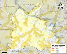 Le retrait-gonflement des sols argileux est susceptible d'engendrer des dommages importants aux bâtiments en cas d’alternance de périodes de sécheresse et de pluie. 30,8 % de la superficie communale est en aléa moyen ou fort (33,6 % au niveau départemental et 48,5 % au niveau national). Sur les 417 bâtiments dénombrés sur la commune en 2019, 105 sont en aléa moyen ou fort, soit 25 %, à comparer aux 25 % au niveau départemental et 54 % au niveau national. Une cartographie de l'exposition du territoire national au retrait gonflement des sols argileux est disponible sur le site du BRGM[16],[Carte 2].