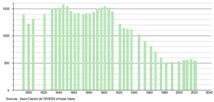 L'évolution du nombre d'habitants est connue à travers les recensements de la population effectués dans la commune depuis 1793. Pour les communes de moins de 10 000 habitants, une enquête de recensement portant sur toute la population est réalisée tous les cinq ans, les populations légales des années intermédiaires étant quant à elles estimées par interpolation ou extrapolation[28]. Pour la commune, le premier recensement exhaustif entrant dans le cadre du nouveau dispositif a été réalisé en 2005[29].