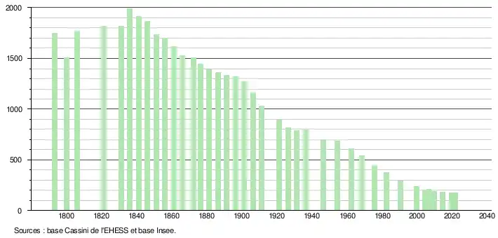 L'évolution du nombre d'habitants est connue à travers les recensements de la population effectués dans la commune depuis 1793. Pour les communes de moins de 10 000 habitants, une enquête de recensement portant sur toute la population est réalisée tous les cinq ans, les populations légales des années intermédiaires étant quant à elles estimées par interpolation ou extrapolation[21]. Pour la commune, le premier recensement exhaustif entrant dans le cadre du nouveau dispositif a été réalisé en 2004[22].